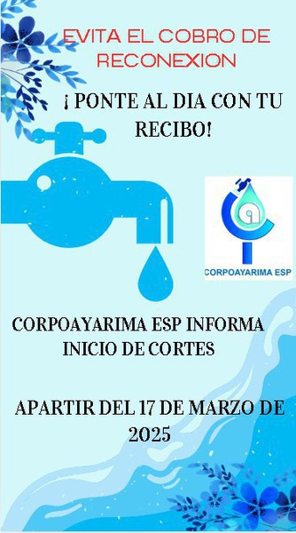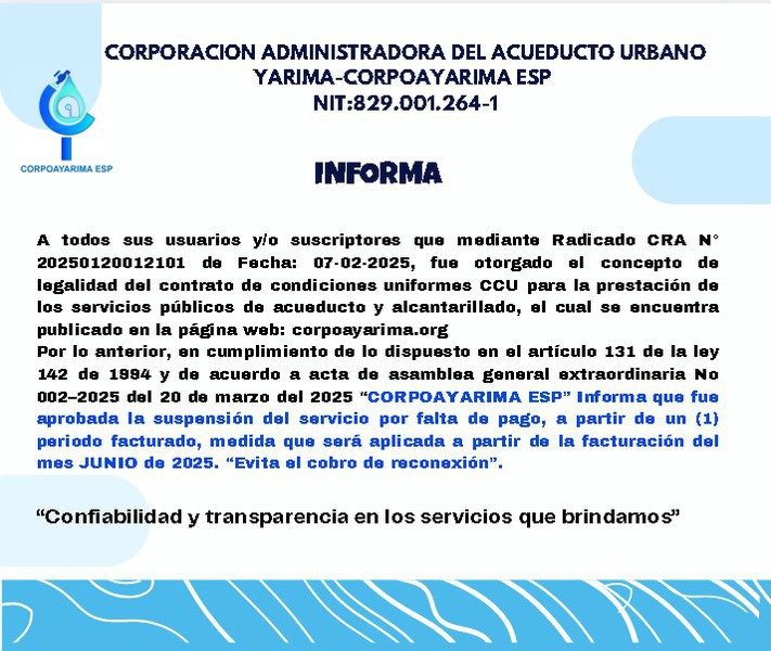 08“CORPOAYARIMA ESP” Informa que fue aprobada la suspensión del servicio por falta de pago, a partir de un (1) periodo facturado, medida que será aplicada a partir de la facturación del mes JUNIO de 2025. “Evita el cobro de reconexión”.