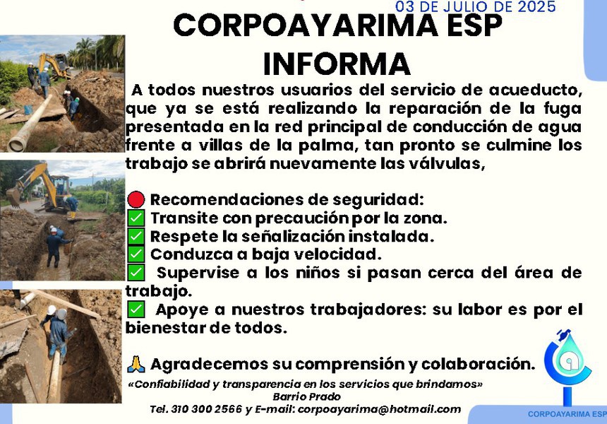 09A todos nuestros usuarios del servicio de acueducto, que ya se está realizando la reparación de la fuga presentada en la red principal, frente a Villas de la palma, tan pronto se culmine las labores de reparación se restablecerá el servicio.